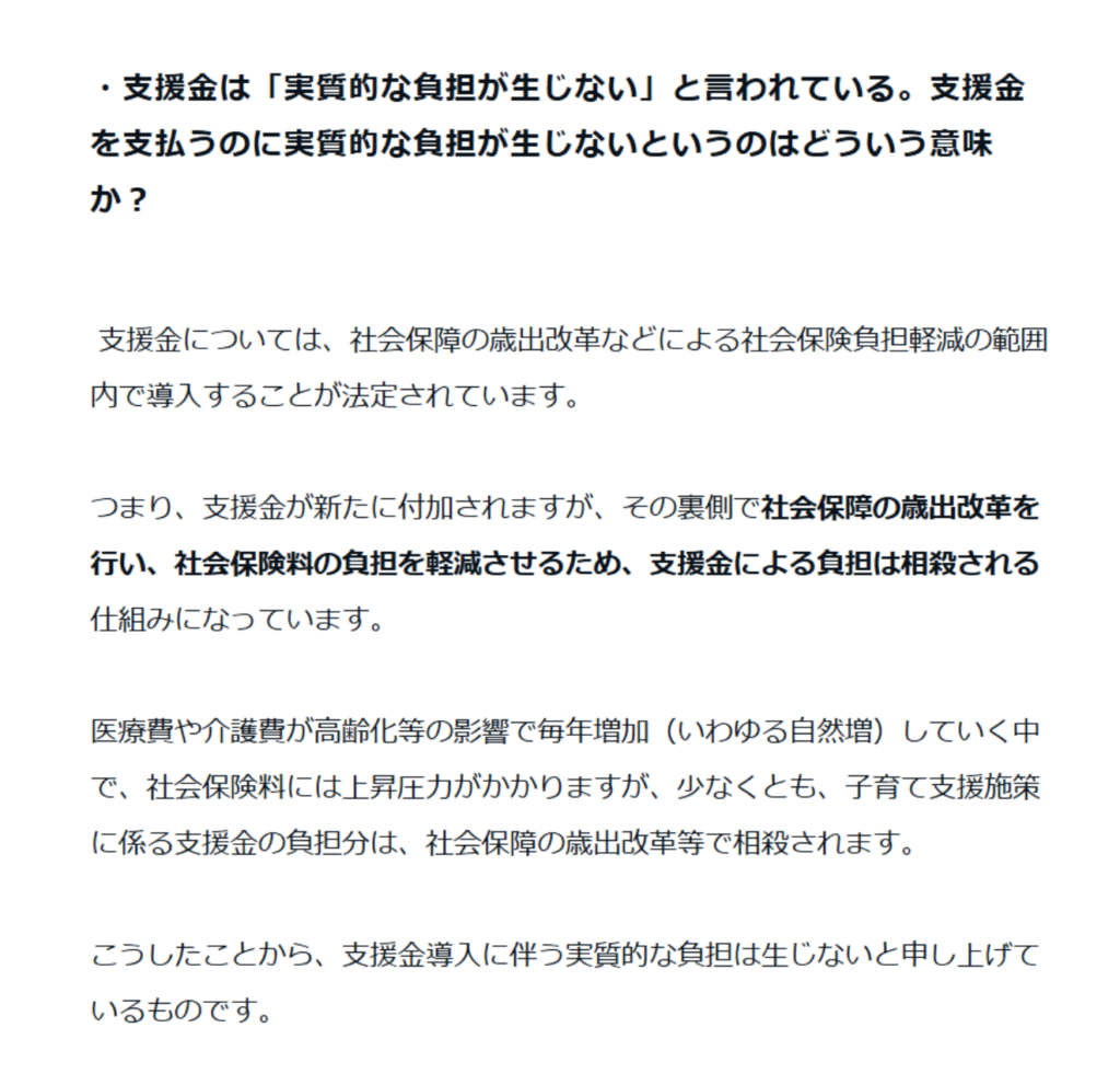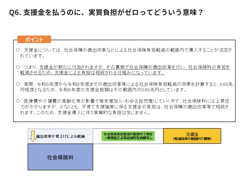 つまり、「支援金で負担は増えるが、他の部分で負担が減るため、差し引きゼロになる」という説明です。