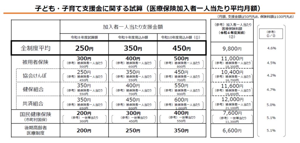 - 子ども・子育て支援金に関する試算(医療保険加入者一人当たり平均月額)(PDF)│こども家庭庁