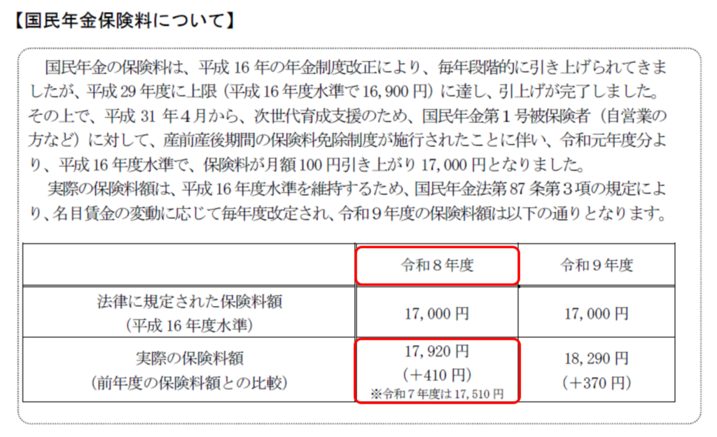 令和8年度の国民年金保険料は、令和7年度の17,510円から410円増額し、月額17,920円となります。これは名目賃金の変動に応じた改定によるものです。